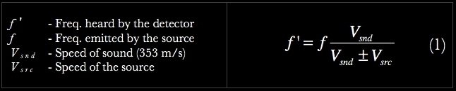 It is interesting to note that the Doppler equation was first tested experimentally in 1845 "using a locomotive drawing an open car with several trumpeters” (Walker et al. 2008). Equation (1) gives the Doppler equation for moving source and stationary detector, however, for the recorded version I chose to move the audience around the butterfly. This type of decision may easily be made "on the fly" in a programming environment like Cycling 74's Max/MSP, the tool I utilize to create my real-time interactive compositions. The Doppler equation for a stationary source and moving detector is: