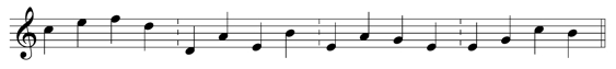 When studying a fluctuating quantity like noise, scientists often analyze its spectral density. White noise is said to have a spectral density of 1/f0 because it produces an uncorrelated sequence of values. Brown noise on the other hand, which has a spectral density of 1/f2, is quite correlated. 1/f noise is often viewed as a compromise midway between white and brown noise (Gardner 1992). 1/f distributions were used to determine all of the pitches in this work. For example, in the first movement the output of the 4-dice version of R.F. Voss’ 1/f algorithm was mapped to a C-major collection in order to create 16-note melodies (Bolognesi 1983). After numerous experimental trial runs of the algorithm, I finally discovered the melody shown in Fig. 1–which was to my liking.